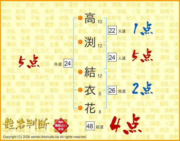 高(10画)渕(12画) 結(12画)衣(6画)花(8画)