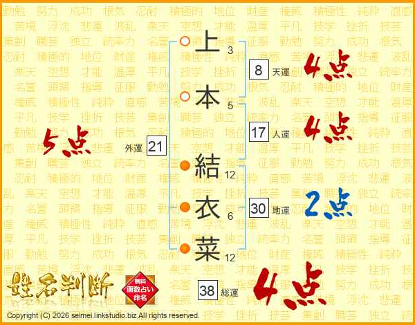 上(3画)本(5画) 結(12画)衣(6画)菜(12画)