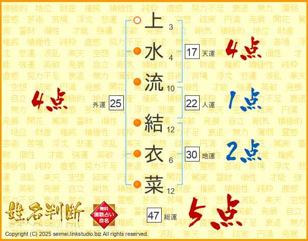 上(3画)水(4画)流(10画) 結(12画)衣(6画)菜(12画)