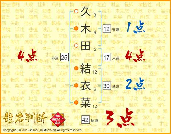 久(3画)木(4画)田(5画) 結(12画)衣(6画)菜(12画)