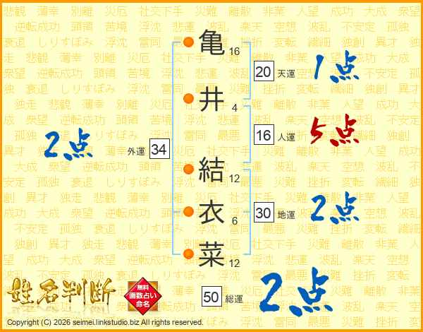 亀(16画)井(4画) 結(12画)衣(6画)菜(12画)