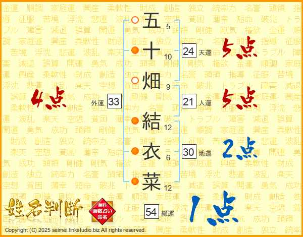 五(5画)十(10画)畑(9画) 結(12画)衣(6画)菜(12画)