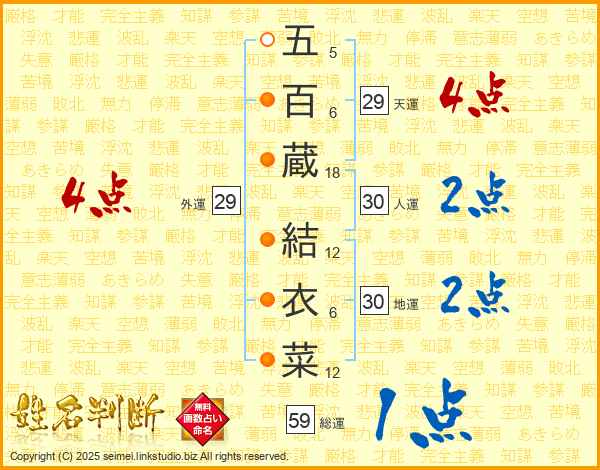 五(5画)百(6画)蔵(18画) 結(12画)衣(6画)菜(12画)