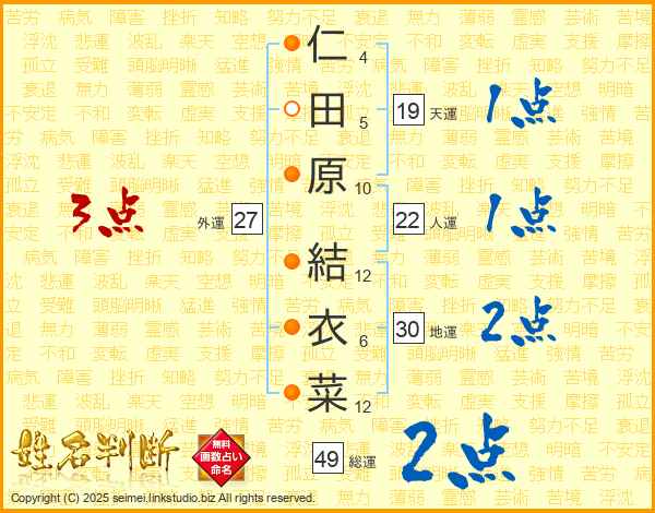 仁(4画)田(5画)原(10画) 結(12画)衣(6画)菜(12画)