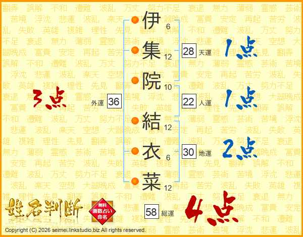 伊(6画)集(12画)院(10画) 結(12画)衣(6画)菜(12画)