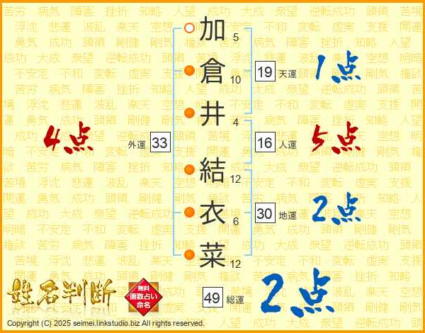 加(5画)倉(10画)井(4画) 結(12画)衣(6画)菜(12画)