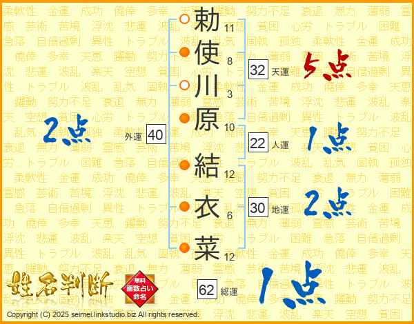 勅(11画)使(8画)川(3画)原(10画) 結(12画)衣(6画)菜(12画)