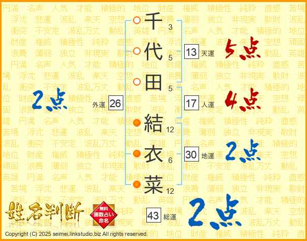 千(3画)代(5画)田(5画) 結(12画)衣(6画)菜(12画)