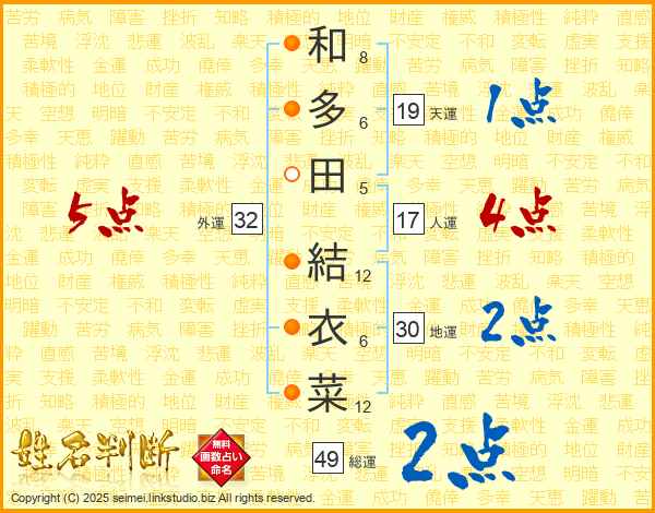 和(8画)多(6画)田(5画) 結(12画)衣(6画)菜(12画)