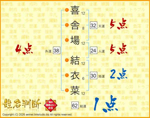喜(12画)舎(8画)場(12画) 結(12画)衣(6画)菜(12画)