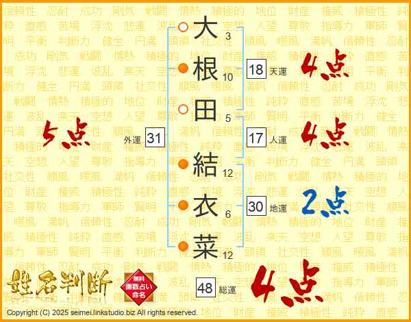 大(3画)根(10画)田(5画) 結(12画)衣(6画)菜(12画)