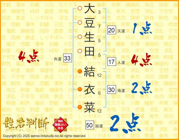 大(3画)豆(7画)生(5画)田(5画) 結(12画)衣(6画)菜(12画)