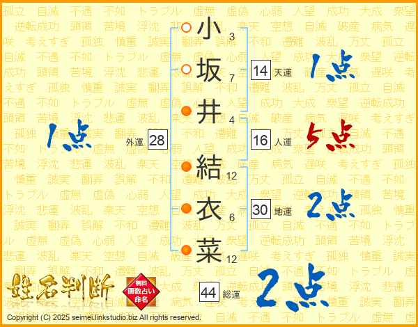 小(3画)坂(7画)井(4画) 結(12画)衣(6画)菜(12画)