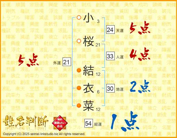 小(3画)桜(21画) 結(12画)衣(6画)菜(12画)