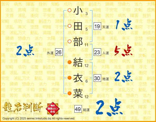 小(3画)田(5画)部(11画) 結(12画)衣(6画)菜(12画)