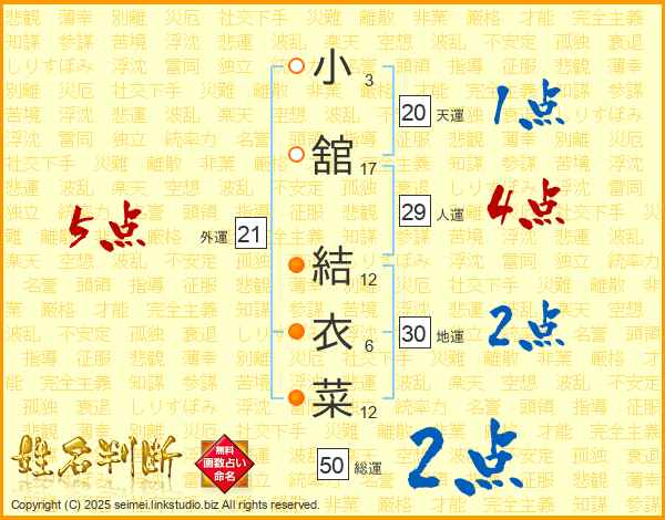 小(3画)舘(17画) 結(12画)衣(6画)菜(12画)