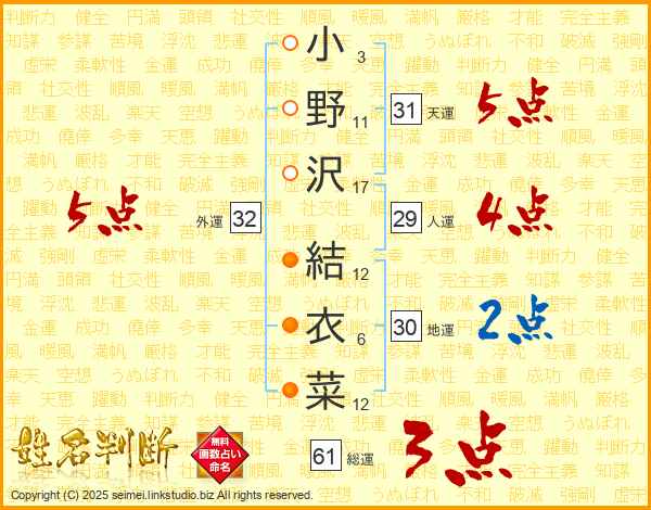 小(3画)野(11画)沢(17画) 結(12画)衣(6画)菜(12画)
