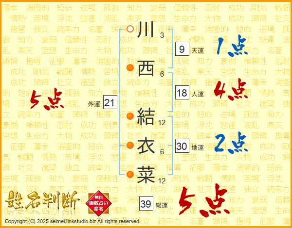 川(3画)西(6画) 結(12画)衣(6画)菜(12画)