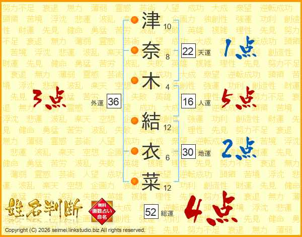 津奈木結衣菜さんの総運は52画の4点!