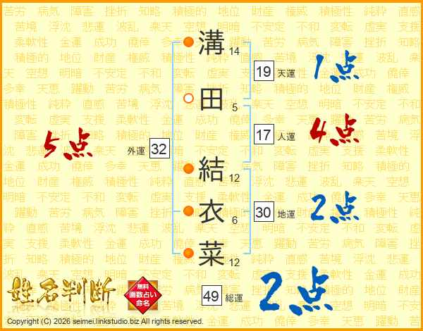 溝(14画)田(5画) 結(12画)衣(6画)菜(12画)