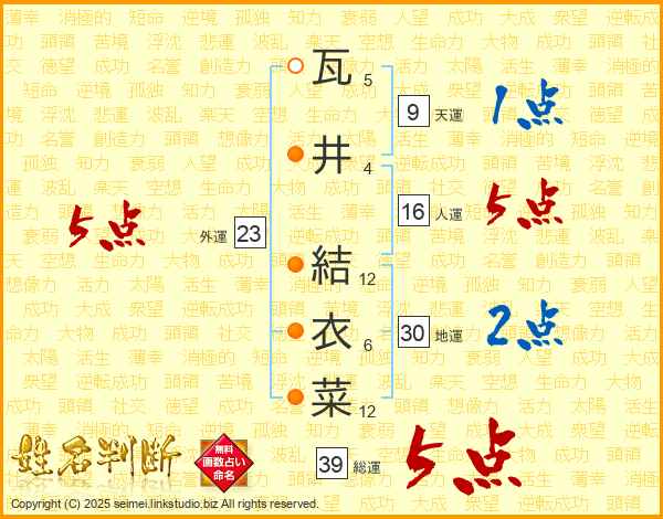 瓦(5画)井(4画) 結(12画)衣(6画)菜(12画)