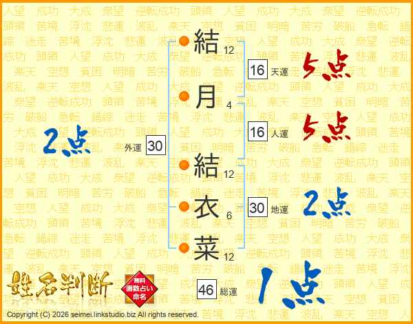結(12画)月(4画) 結(12画)衣(6画)菜(12画)
