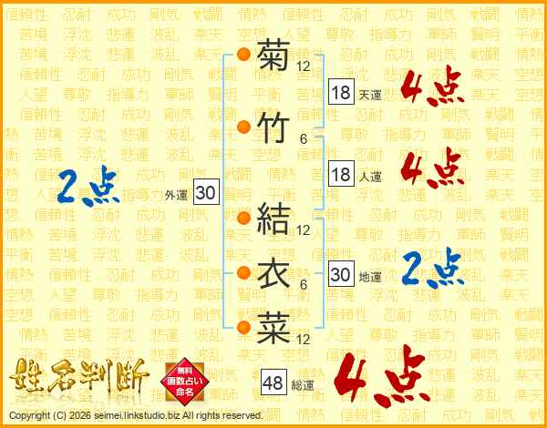 菊(12画)竹(6画) 結(12画)衣(6画)菜(12画)