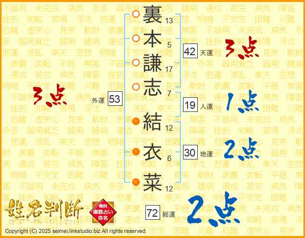 裏本謙志結衣菜さんの総運は72画の2点!