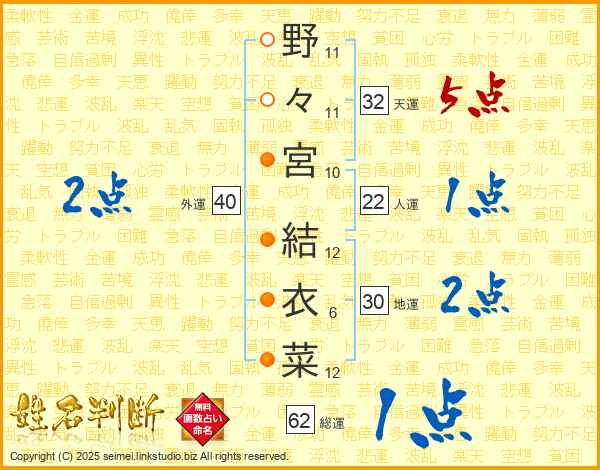 野(11画)々(11画)宮(10画) 結(12画)衣(6画)菜(12画)