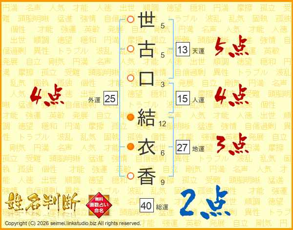 世(5画)古(5画)口(3画) 結(12画)衣(6画)香(9画)