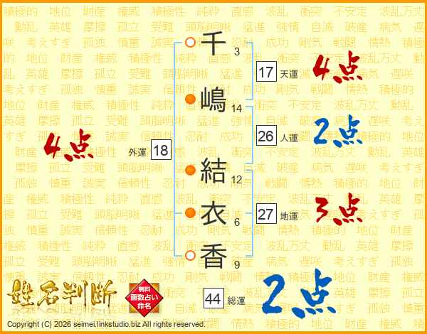 千(3画)嶋(14画) 結(12画)衣(6画)香(9画)