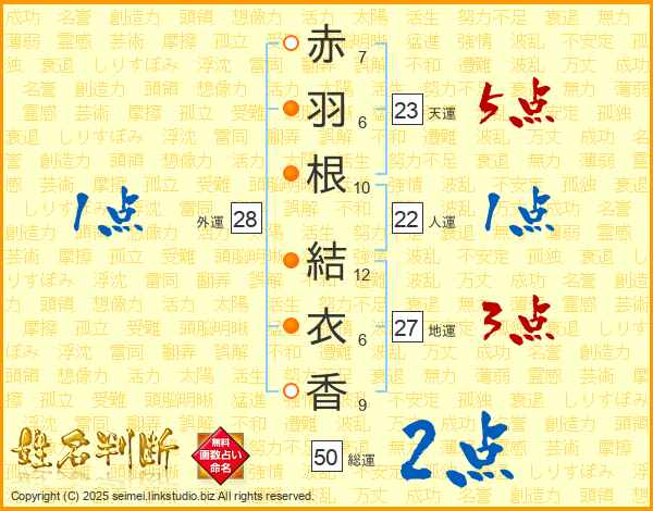 赤(7画)羽(6画)根(10画) 結(12画)衣(6画)香(9画)
