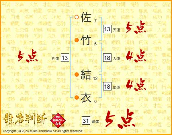 佐(7画)竹(6画) 結(12画)衣(6画)