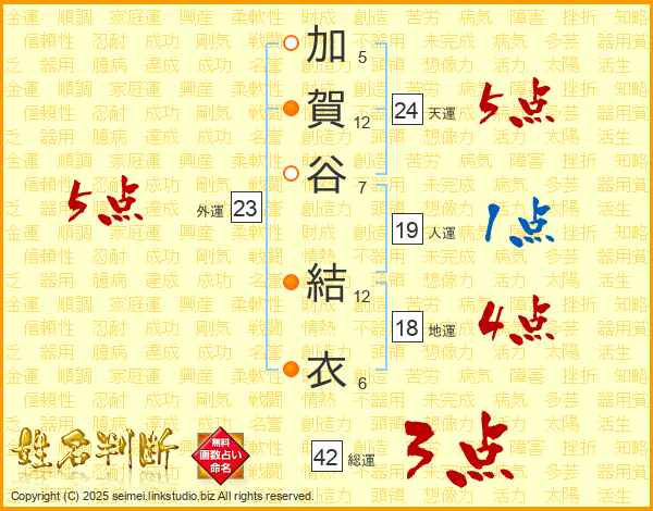加(5画)賀(12画)谷(7画) 結(12画)衣(6画)