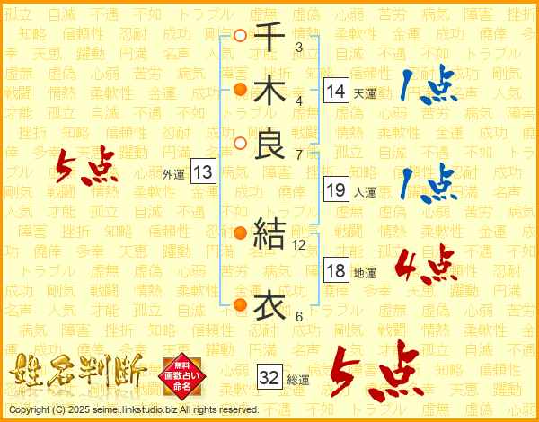 千(3画)木(4画)良(7画) 結(12画)衣(6画)