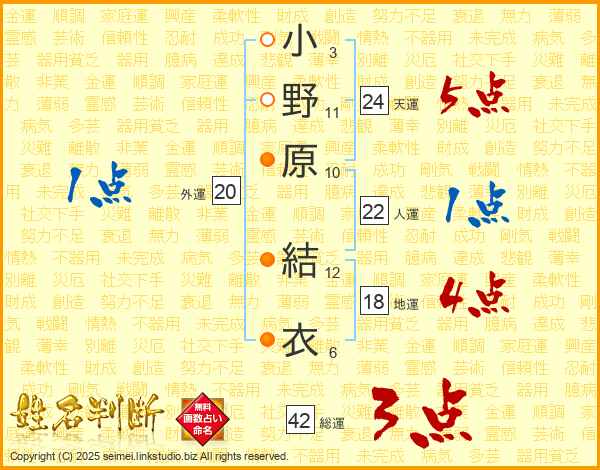 小(3画)野(11画)原(10画) 結(12画)衣(6画)