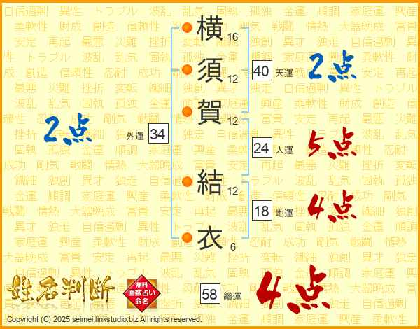 横(16画)須(12画)賀(12画) 結(12画)衣(6画)