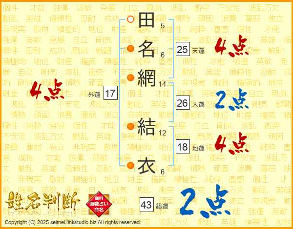 田(5画)名(6画)網(14画) 結(12画)衣(6画)