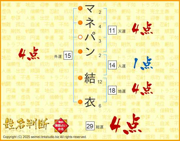 マ(2画)ネ(4画)パ(3画)ン(2画) 結(12画)衣(6画)