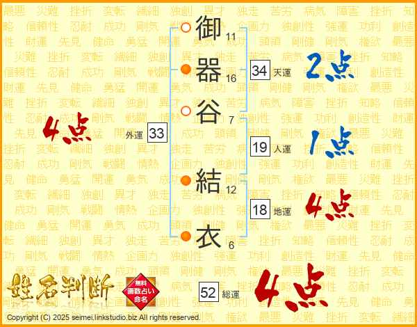 御(11画)器(16画)谷(7画) 結(12画)衣(6画)