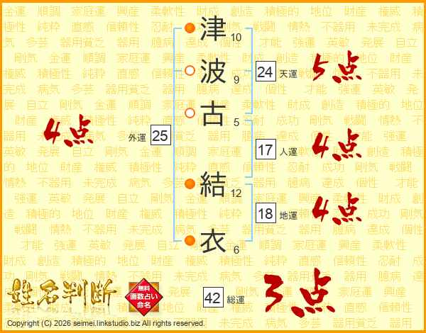 津(10画)波(9画)古(5画) 結(12画)衣(6画)
