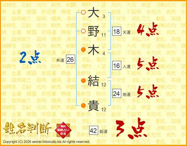 大(3画)野(11画)木(4画) 結(12画)貴(12画)