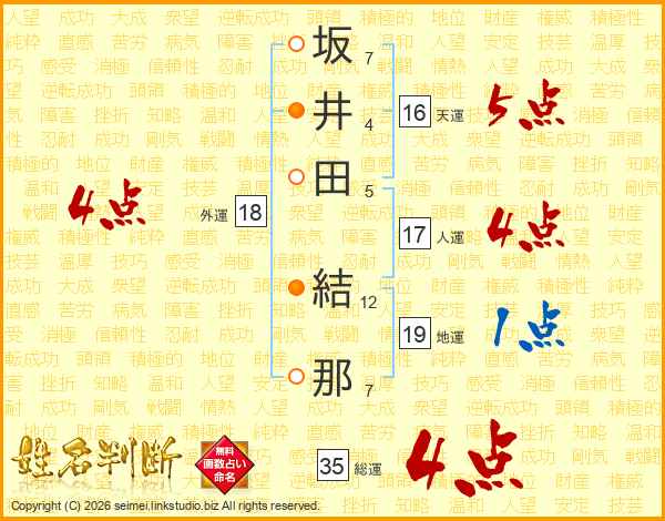 坂(7画)井(4画)田(5画) 結(12画)那(7画)