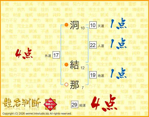 生活面を象徴する運勢です。外部から受ける影響力を表し、結婚運、家庭運や職場、環境への順応性を表します。総運から人運を引いた画数。姓や名が1文字の場合を除く。