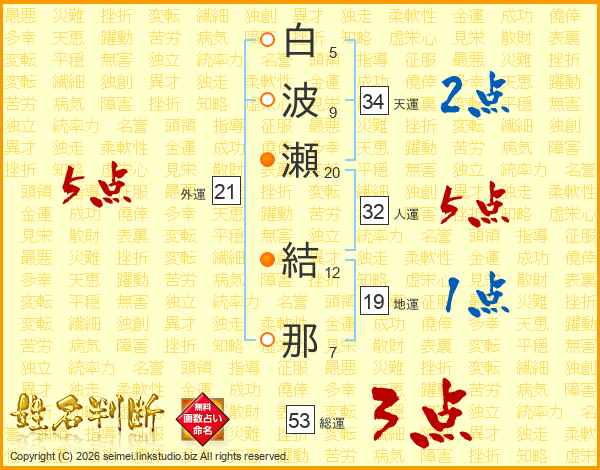 白(5画)波(9画)瀬(20画) 結(12画)那(7画)