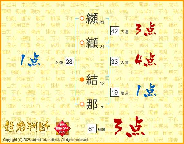 生活面を象徴する運勢です。外部から受ける影響力を表し、結婚運、家庭運や職場、環境への順応性を表します。総運から人運を引いた画数。姓や名が1文字の場合を除く。