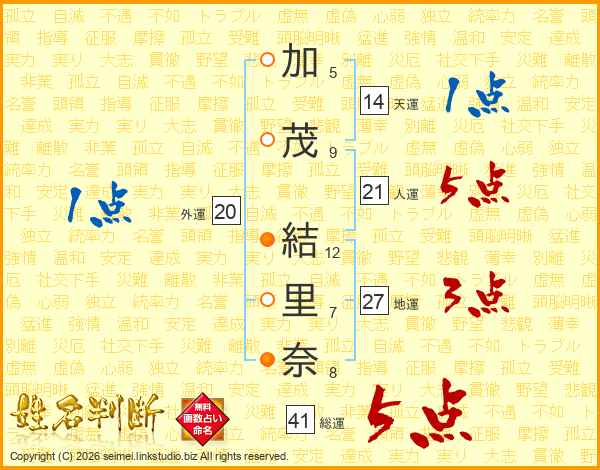 加(5画)茂(9画) 結(12画)里(7画)奈(8画)