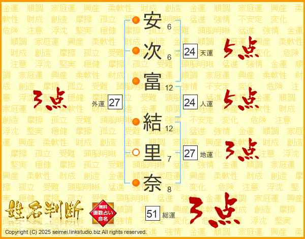 安(6画)次(6画)富(12画) 結(12画)里(7画)奈(8画)