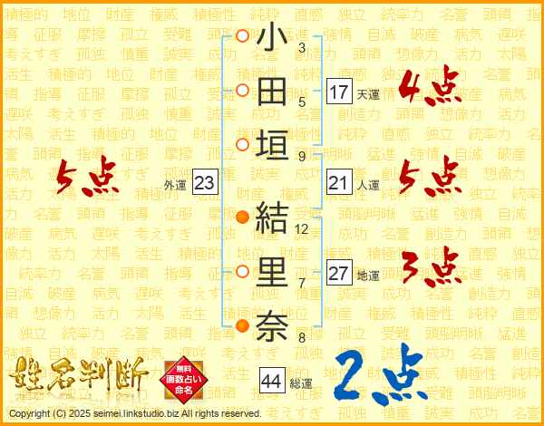 小(3画)田(5画)垣(9画) 結(12画)里(7画)奈(8画)
