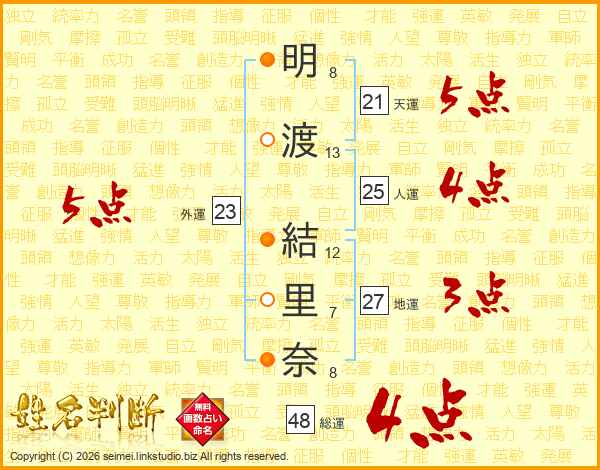 明(8画)渡(13画) 結(12画)里(7画)奈(8画)